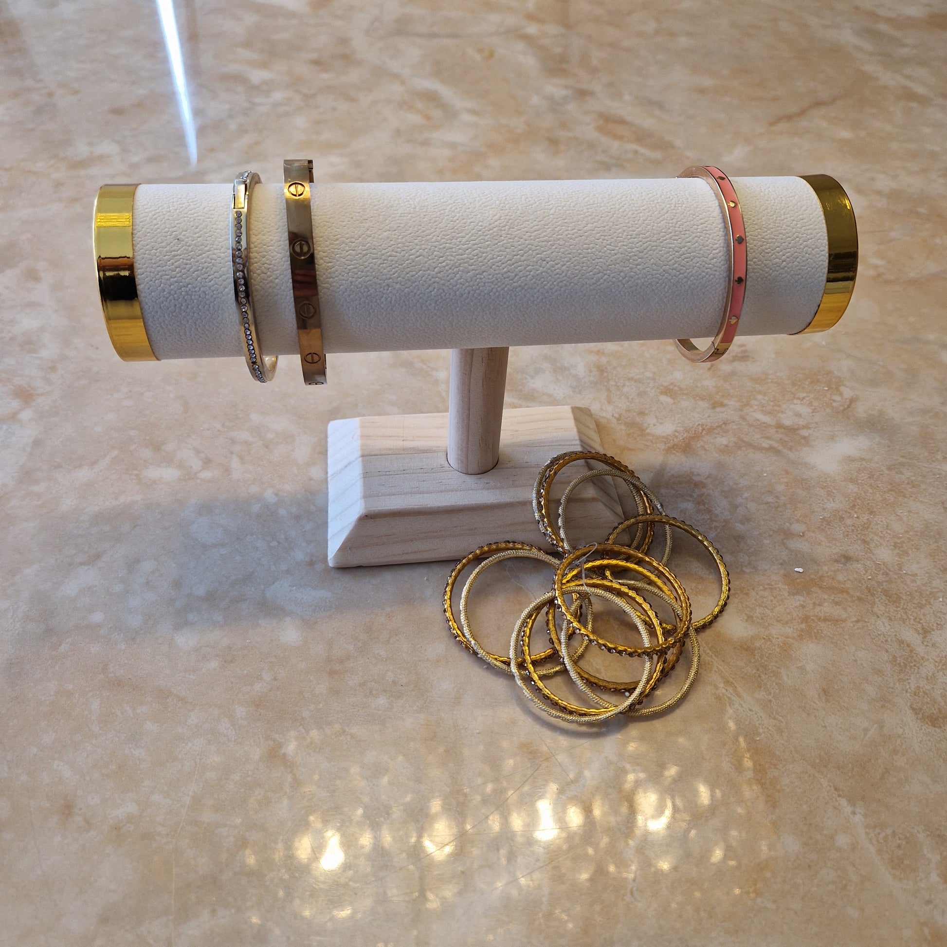 A cream leather rod capped with gold ends on a wooden base. Elegant way to display your bangles, bracelets and watches etc.